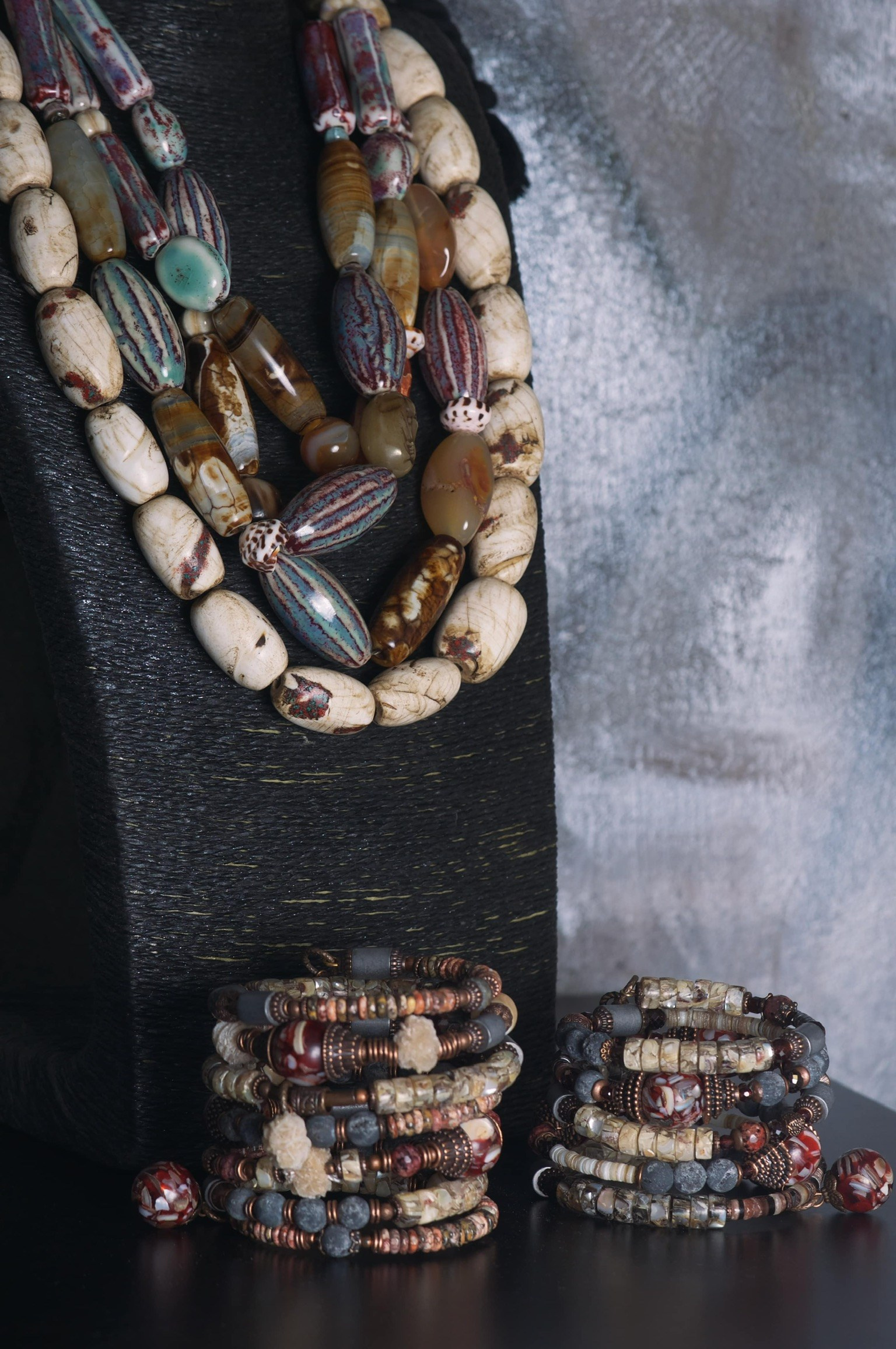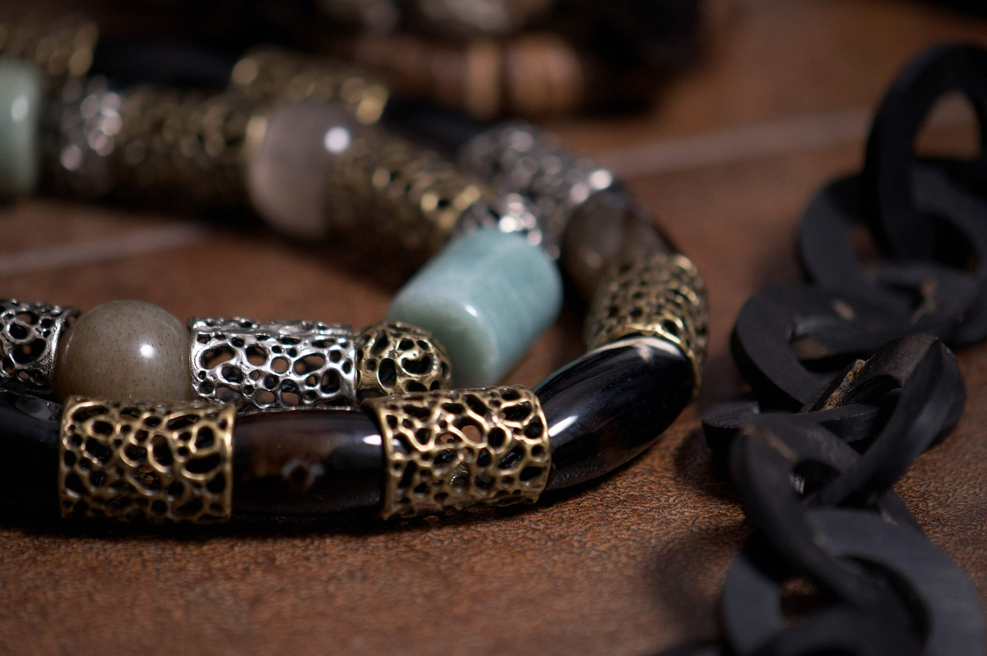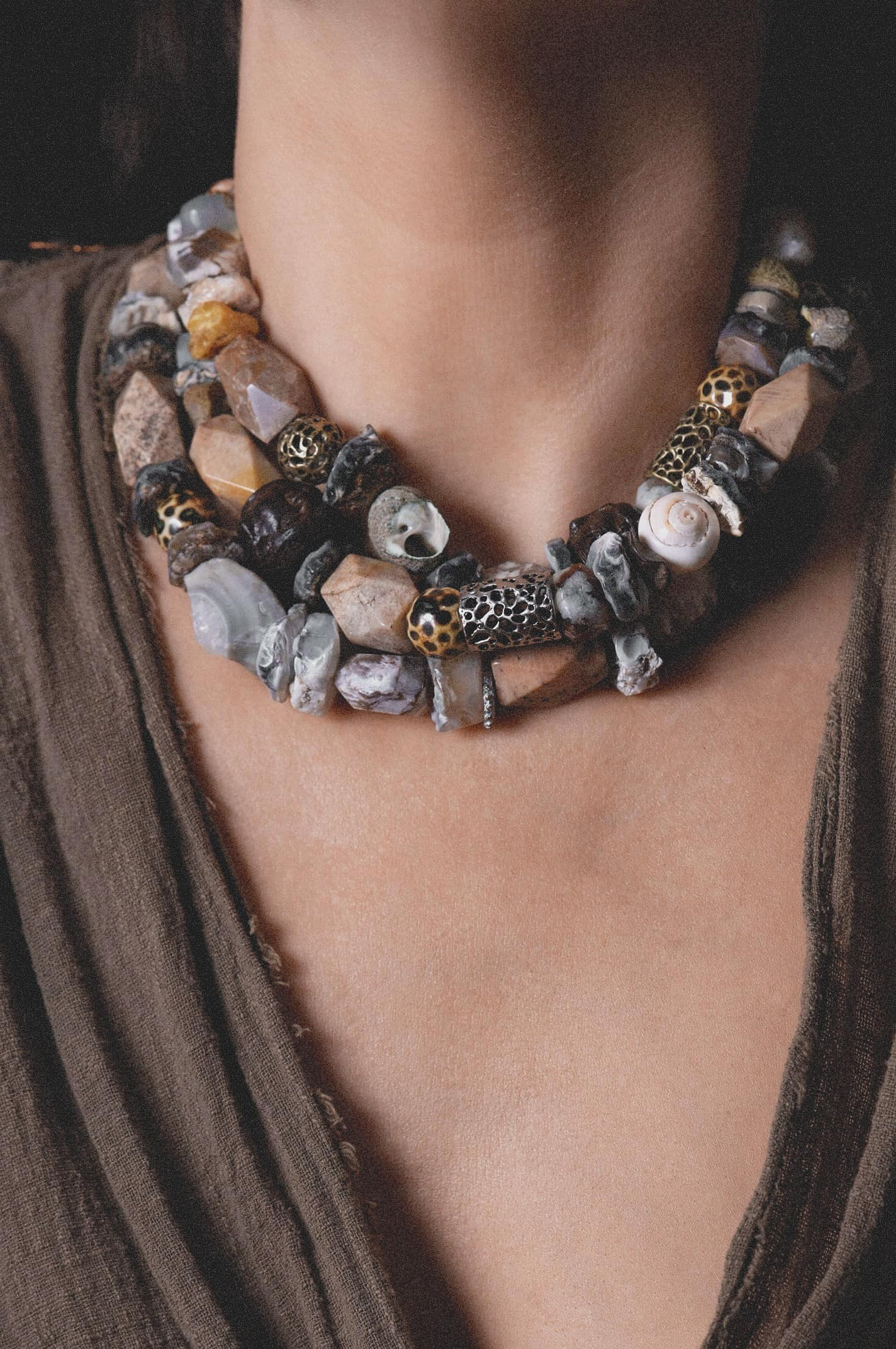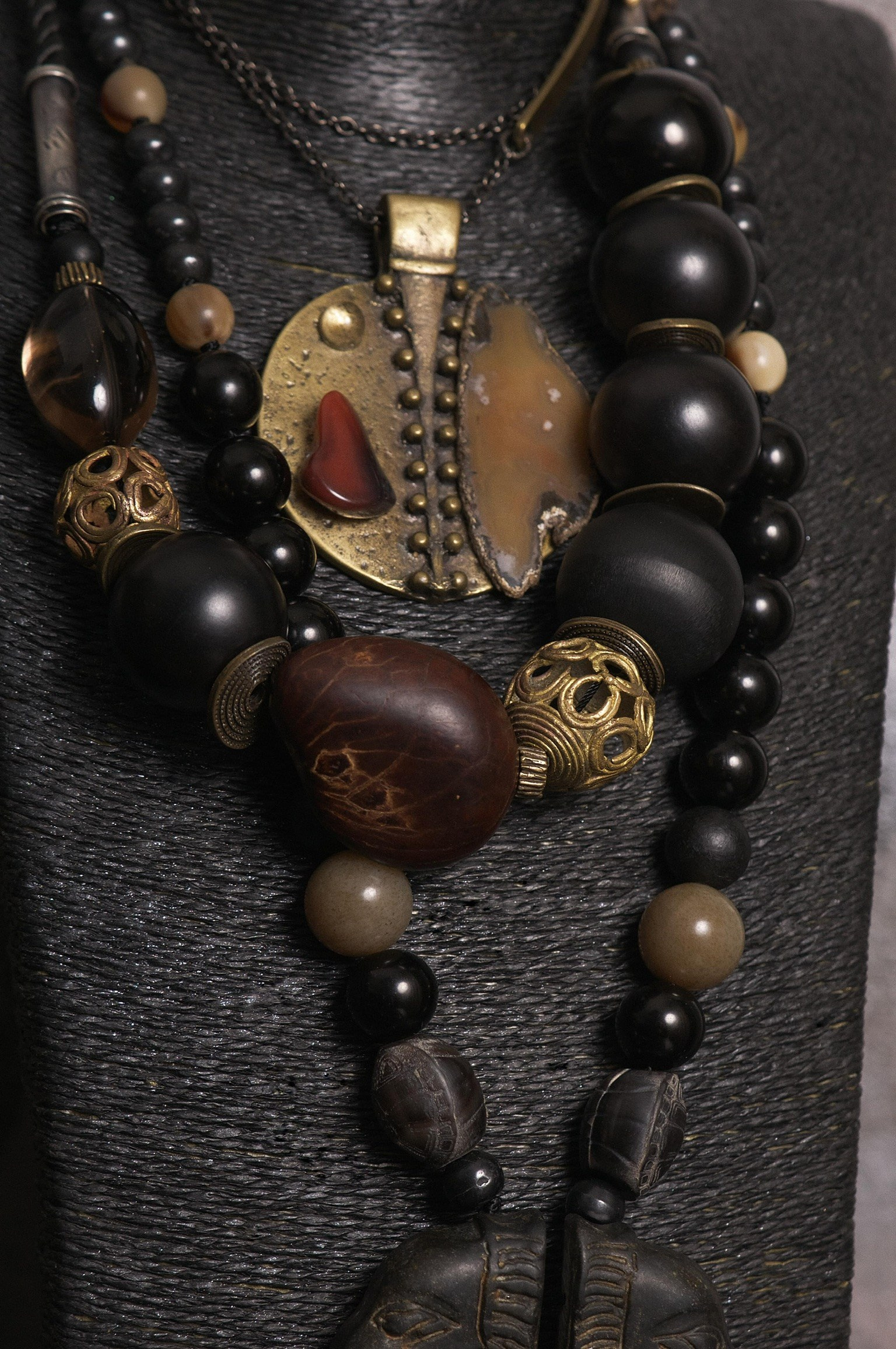 Основа коллекции — аутентичные этнические формы и поразительная гармония цветов, мастерское сочетание оттенков камней, этнических бусин и артефактов найденных на разных континентах.